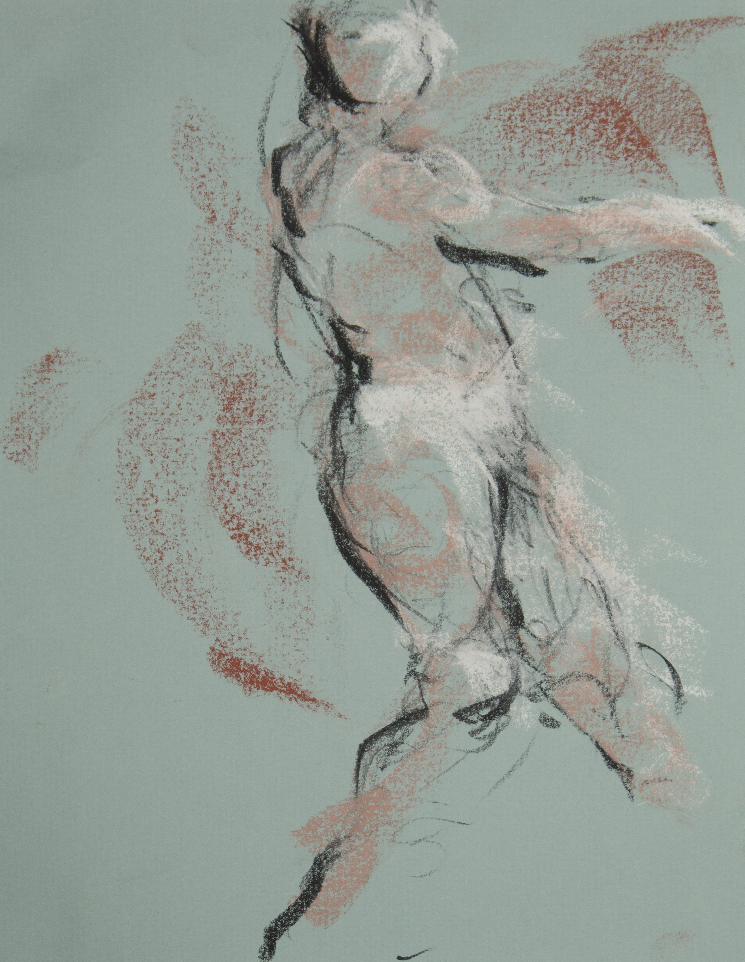 After several decades of constant life drawing I have worked out a method that keeps joy in the process and sustains me day to day. I start with a thick contour and then smudge it with a cloth after which I refine with a more definitive line and add shadow and highlights to finish. I have been exploring a multicolored line and add energy to the charcoal line with adjacent color often bright or complementary to the overall tone. I like to price my work affordably so that it is accessible to the widest possible audience. We need original art on our walls and in our lives. I am always honored when my drawings are chosen.