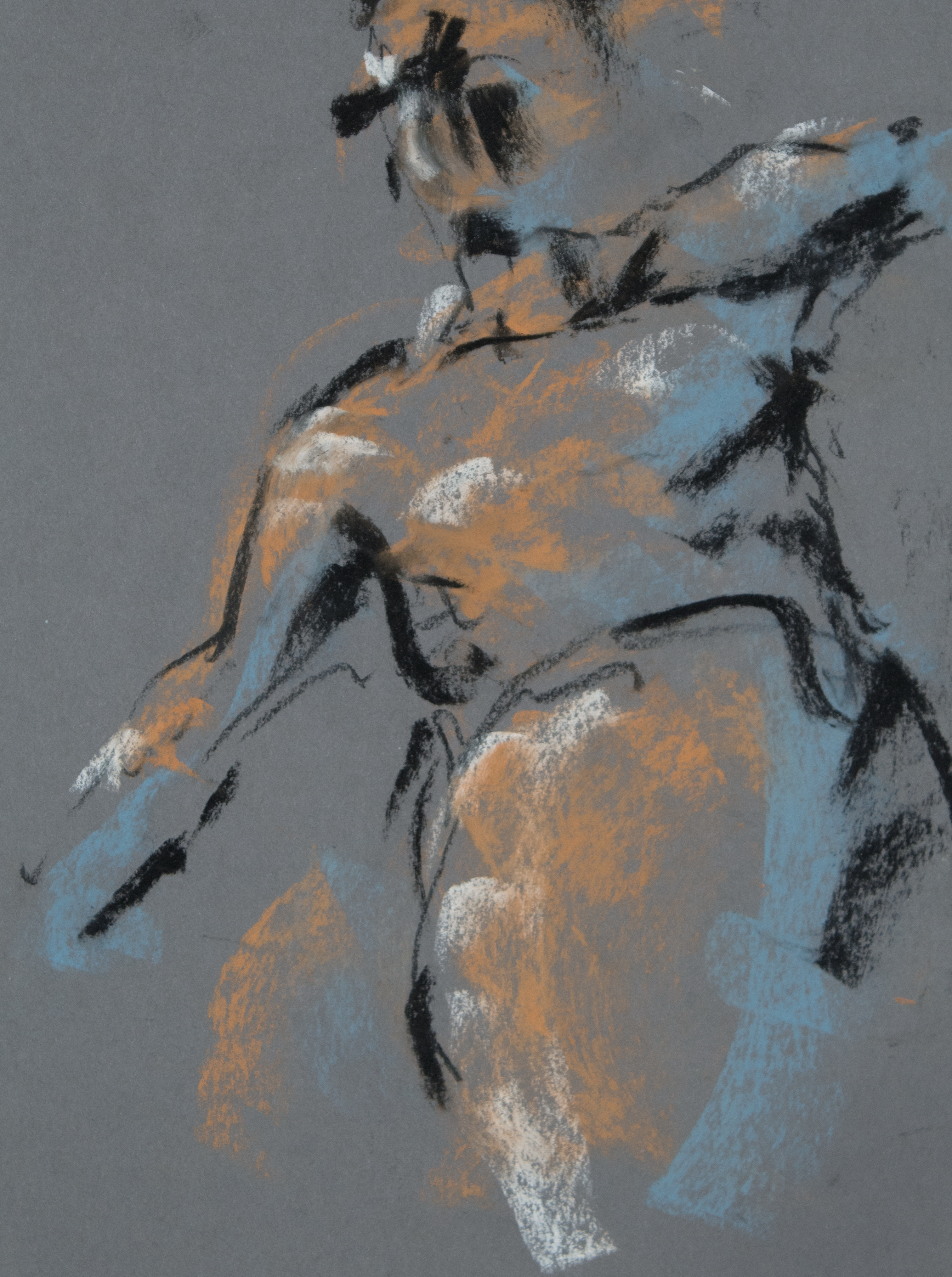 The drawing is done in charcoal and pastel chalk on gray paper.