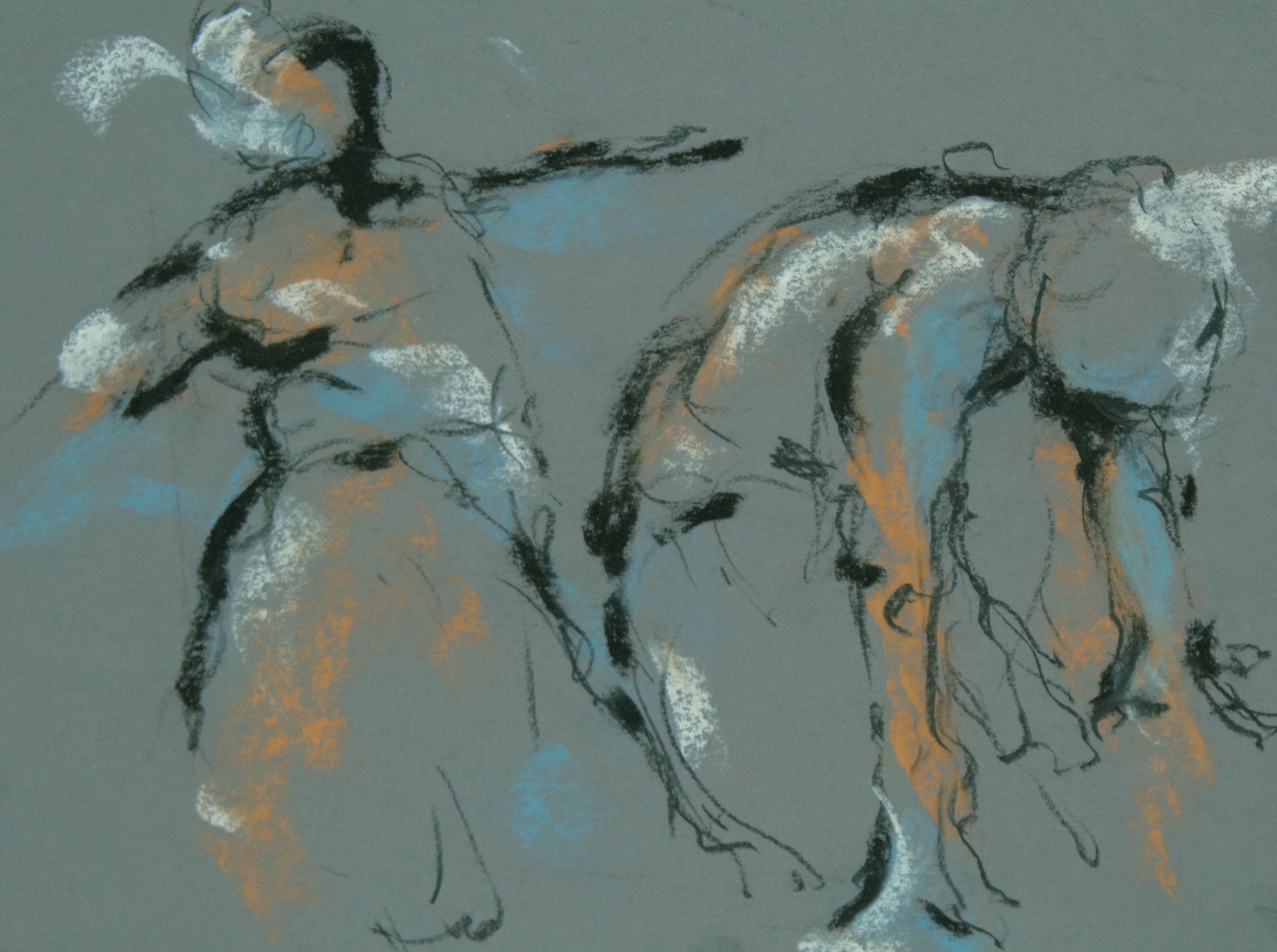 The drawing is done in charcoal and pastel chalk on gray paper.