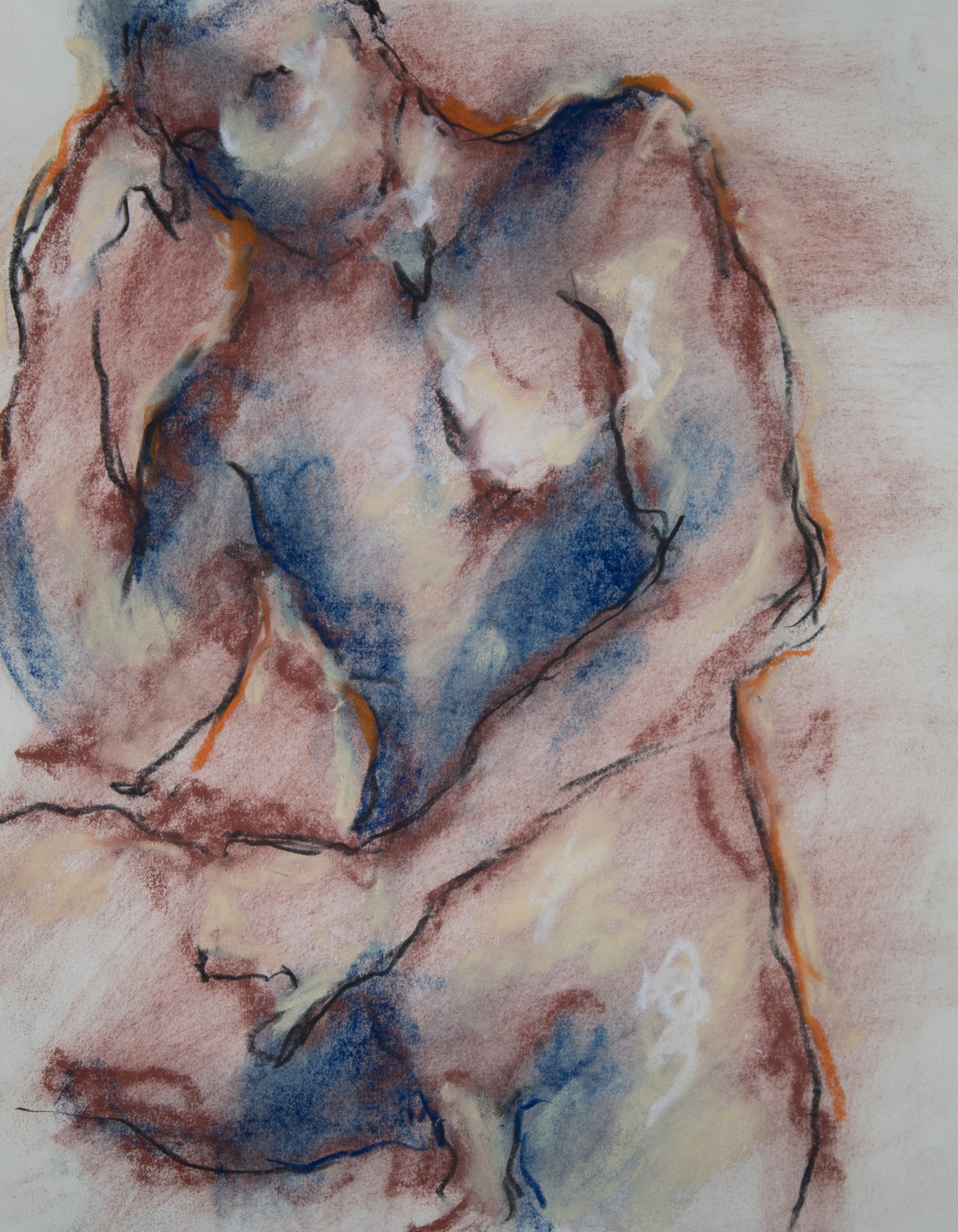 Drawing is of nude male done in charcoal and pastel on white drawing paper.