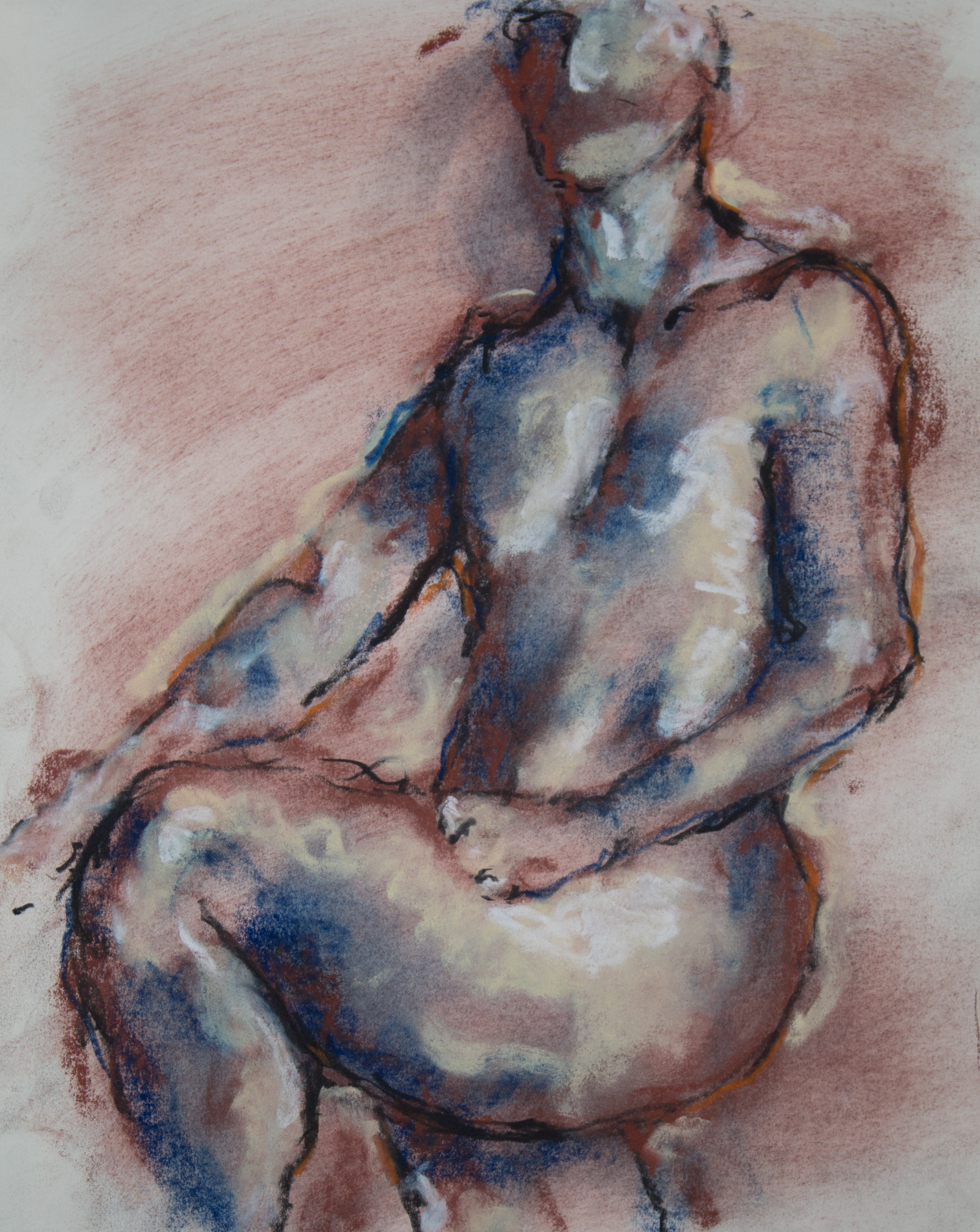 Drawing is of nude male done in charcoal and pastel on white drawing paper.