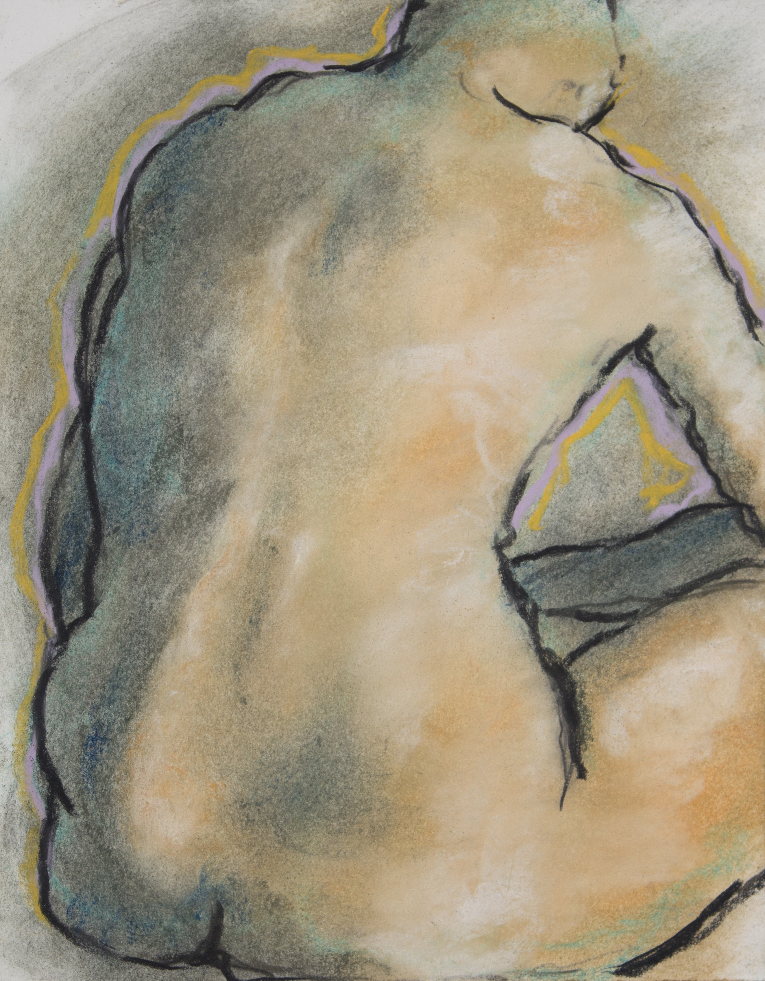 After several decades of constant life drawing I have worked out a method that keeps joy in the process and sustains me day to day. I start with a thick contour and then smudge it with a cloth after which I refine with a more definitive line and add shadow and highlights to finish. I have been exploring a multicolored line and add energy to the charcoal line with adjacent color often bright or complementary to the overall tone. I like to price my work affordably so that it is accessible to the widest possible audience. We need original art on our walls and in our lives. I am always honored when my drawings are chosen.