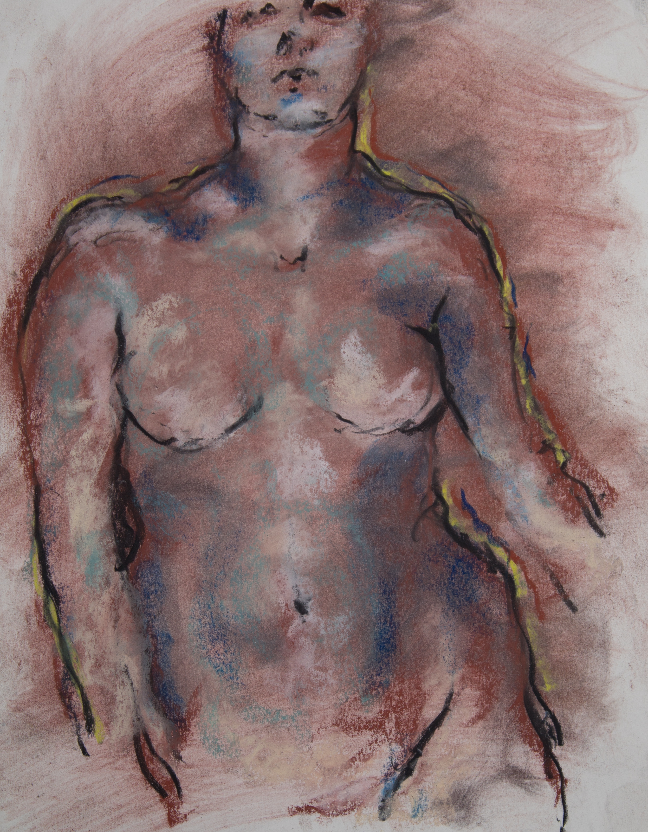 Drawing is of nude female done in charcoal and pastel on white drawing paper.