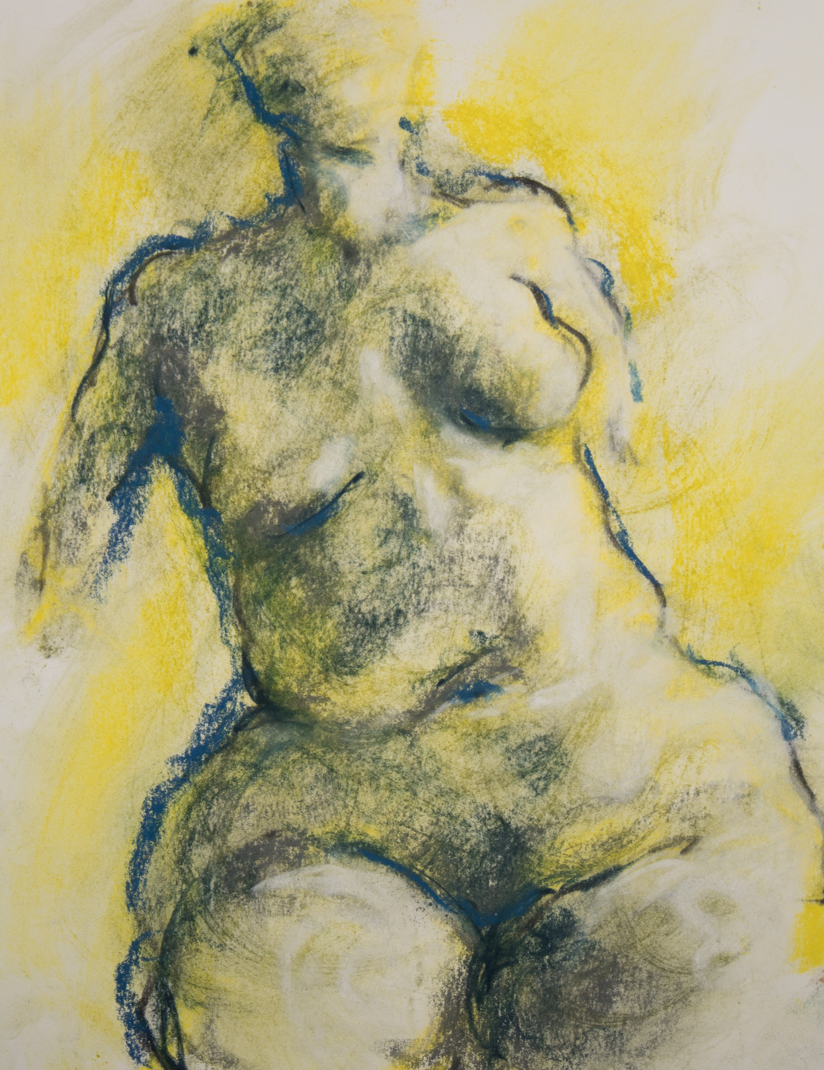 I nearly always start my drawings with a thick outline of the figure and then wipe vigorously to create a mid-tone. I then refine the lines with charcoal and use various pastel colors to add shadow and highlights and finish with another line of bright colored pastel pencil.