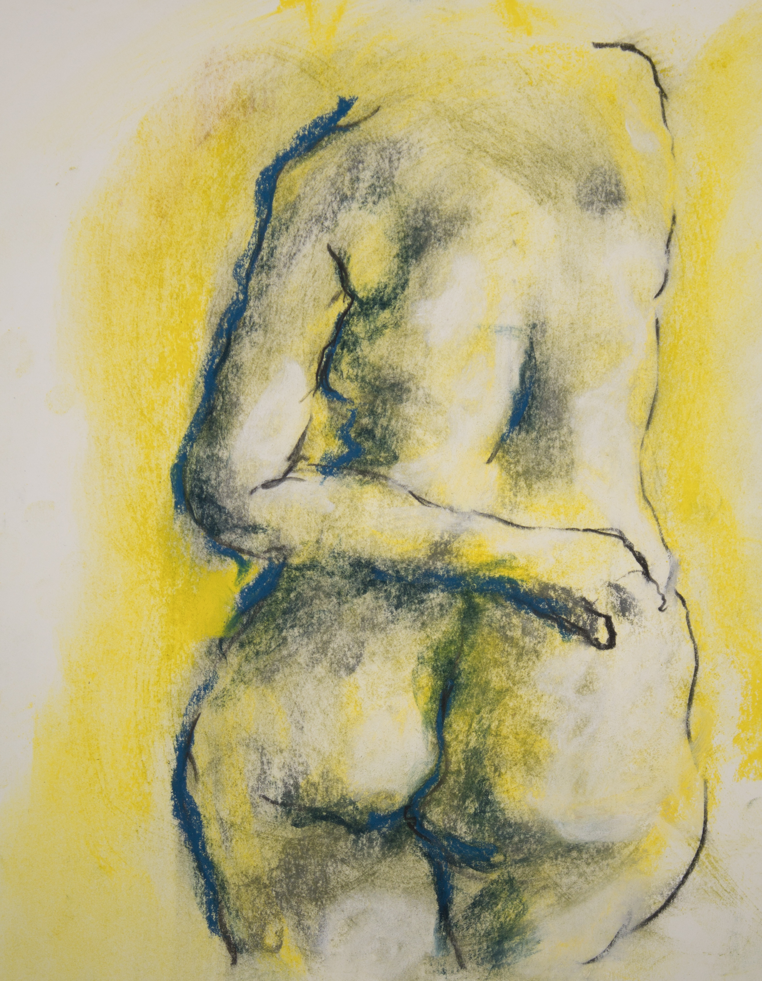 Drawing is of nude female done in charcoal and pastel on white drawing paper.