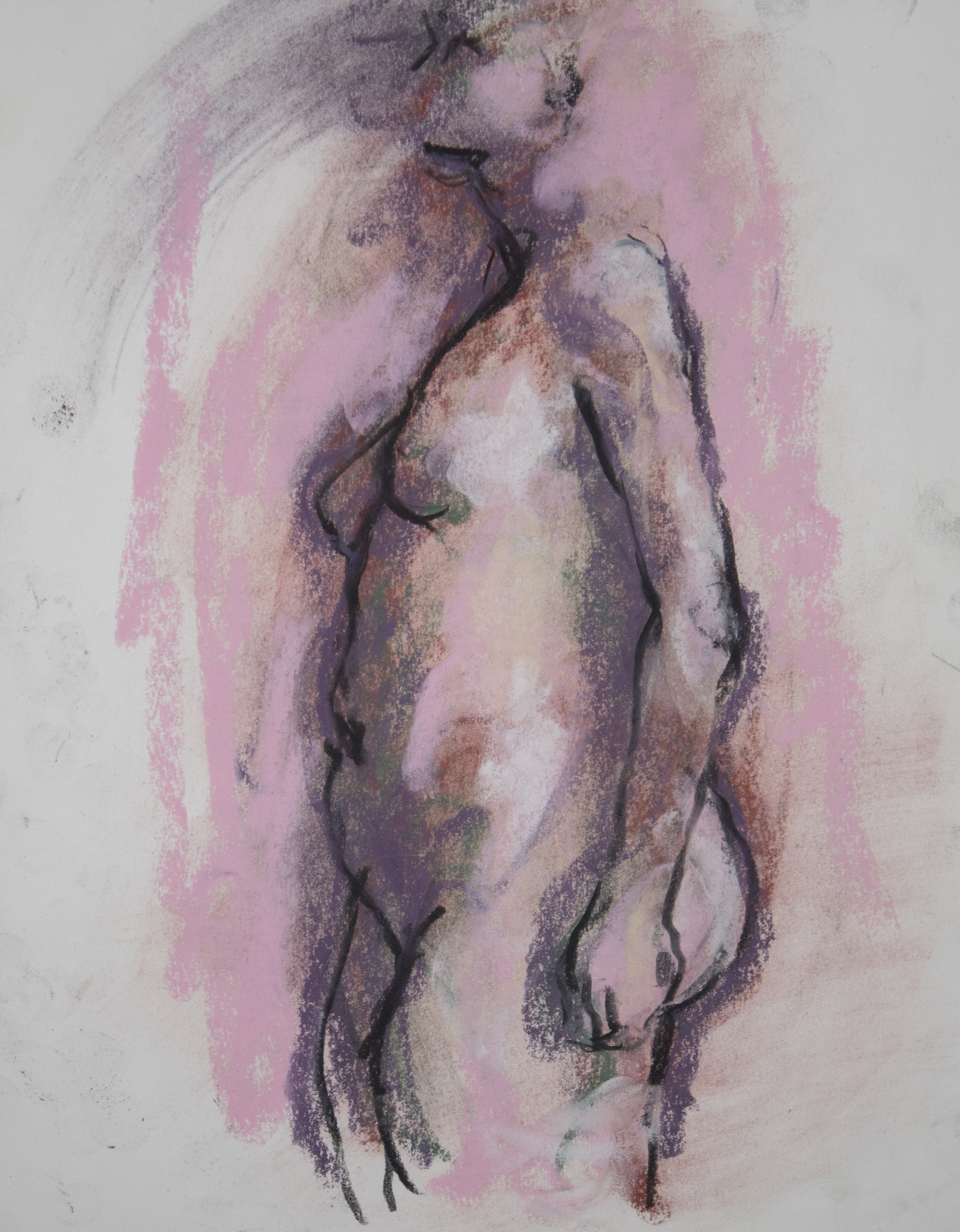 Drawing is of nude female done in charcoal and pastel on white drawing paper.
