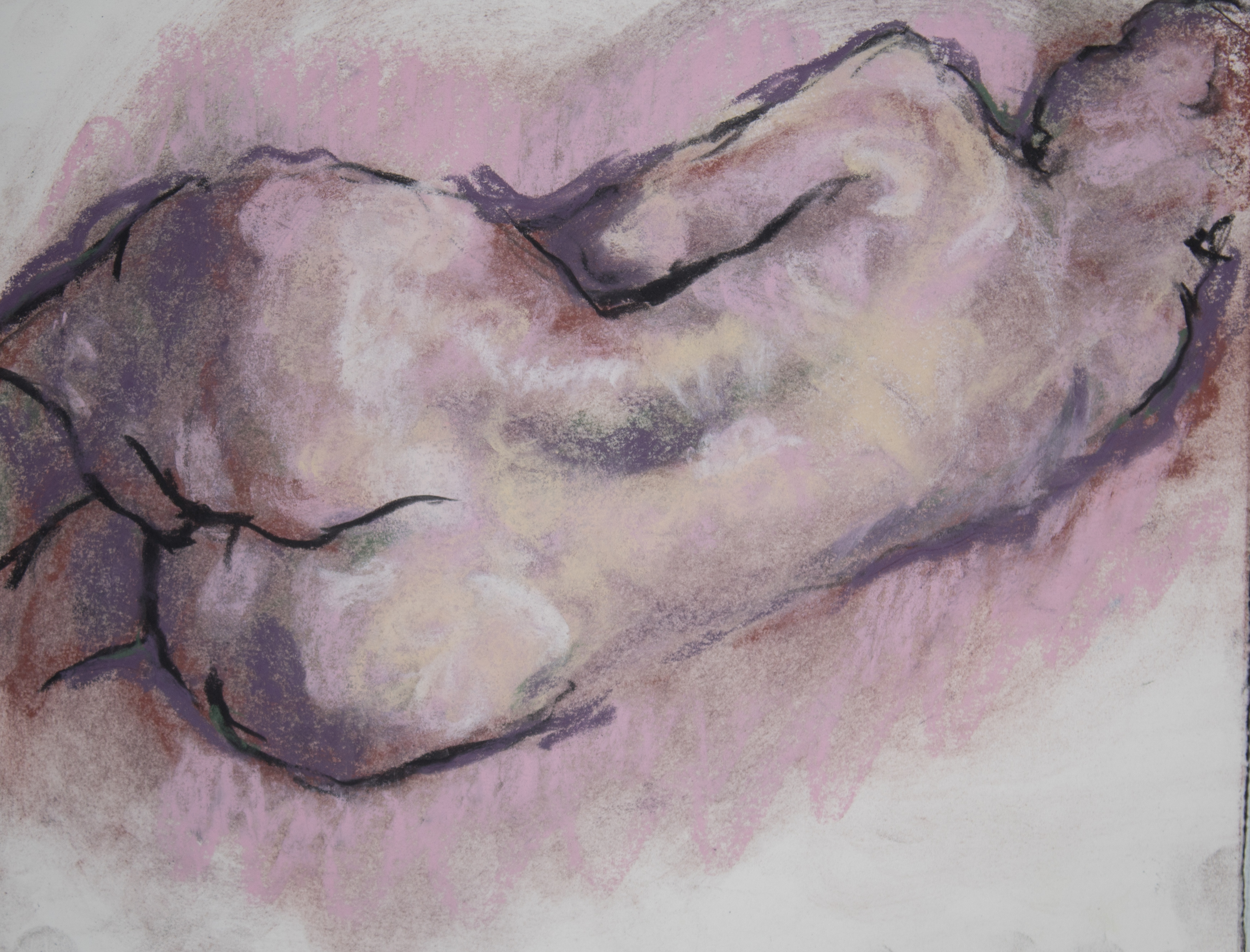 I nearly always start my drawings with a thick outline of the figure and then wipe vigorously to create a mid-tone. I then refine the lines with charcoal and use various pastel colors to add shadow and highlights and finish with another line of bright colored pastel pencil.