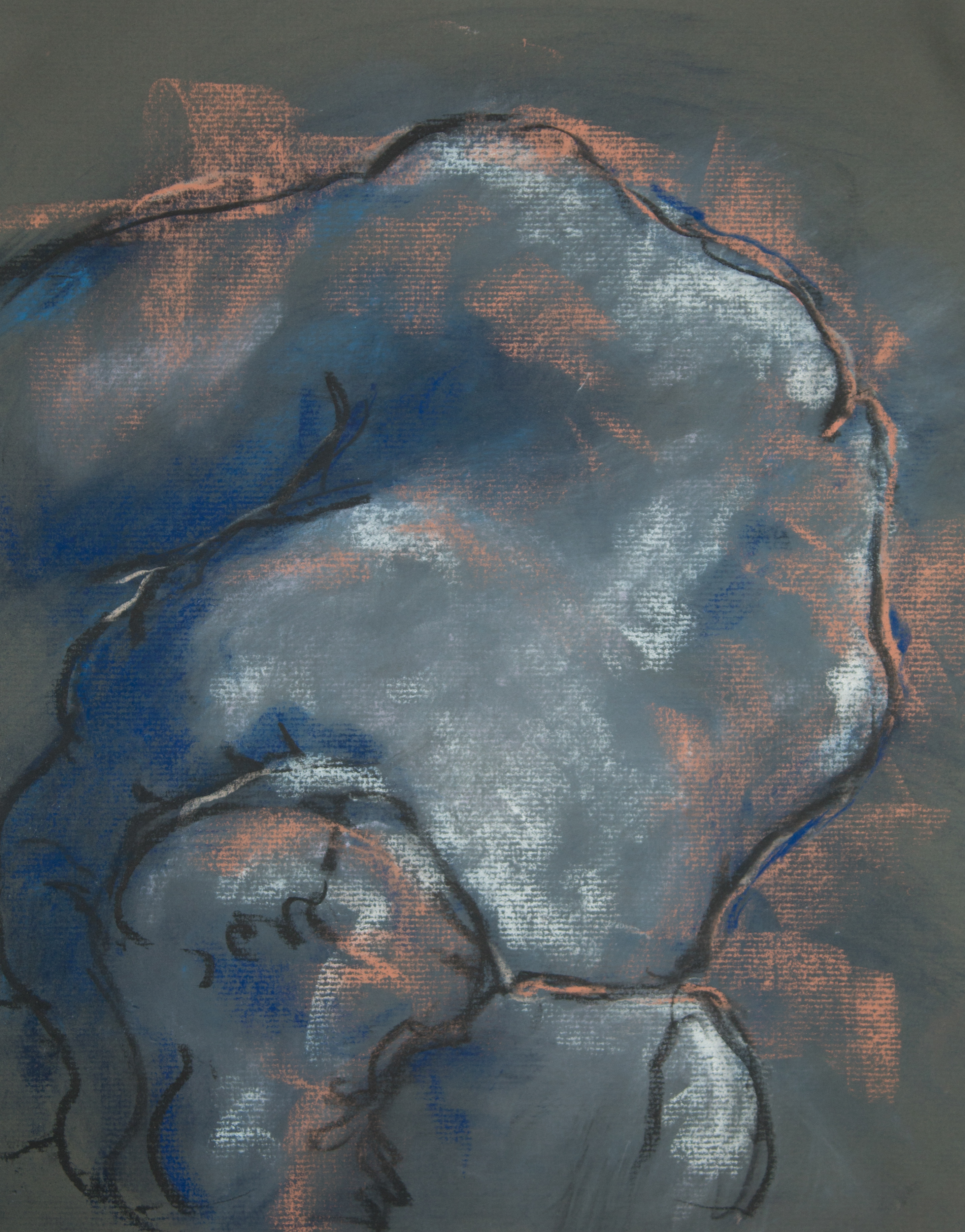 Drawing is of nude female done in charcoal and pastel on gray drawing paper.