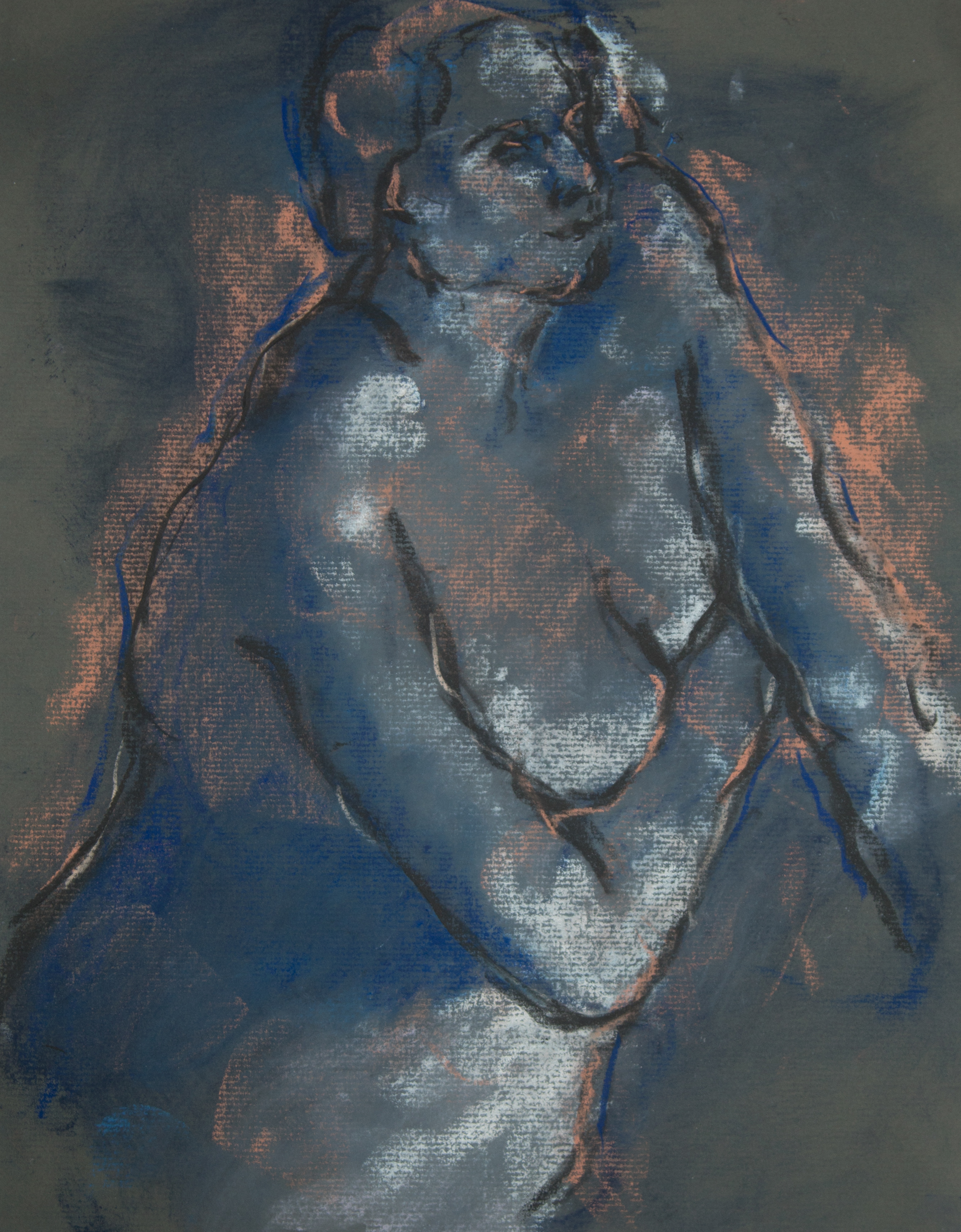 Drawing is of nude female done in charcoal and pastel on gray drawing paper.