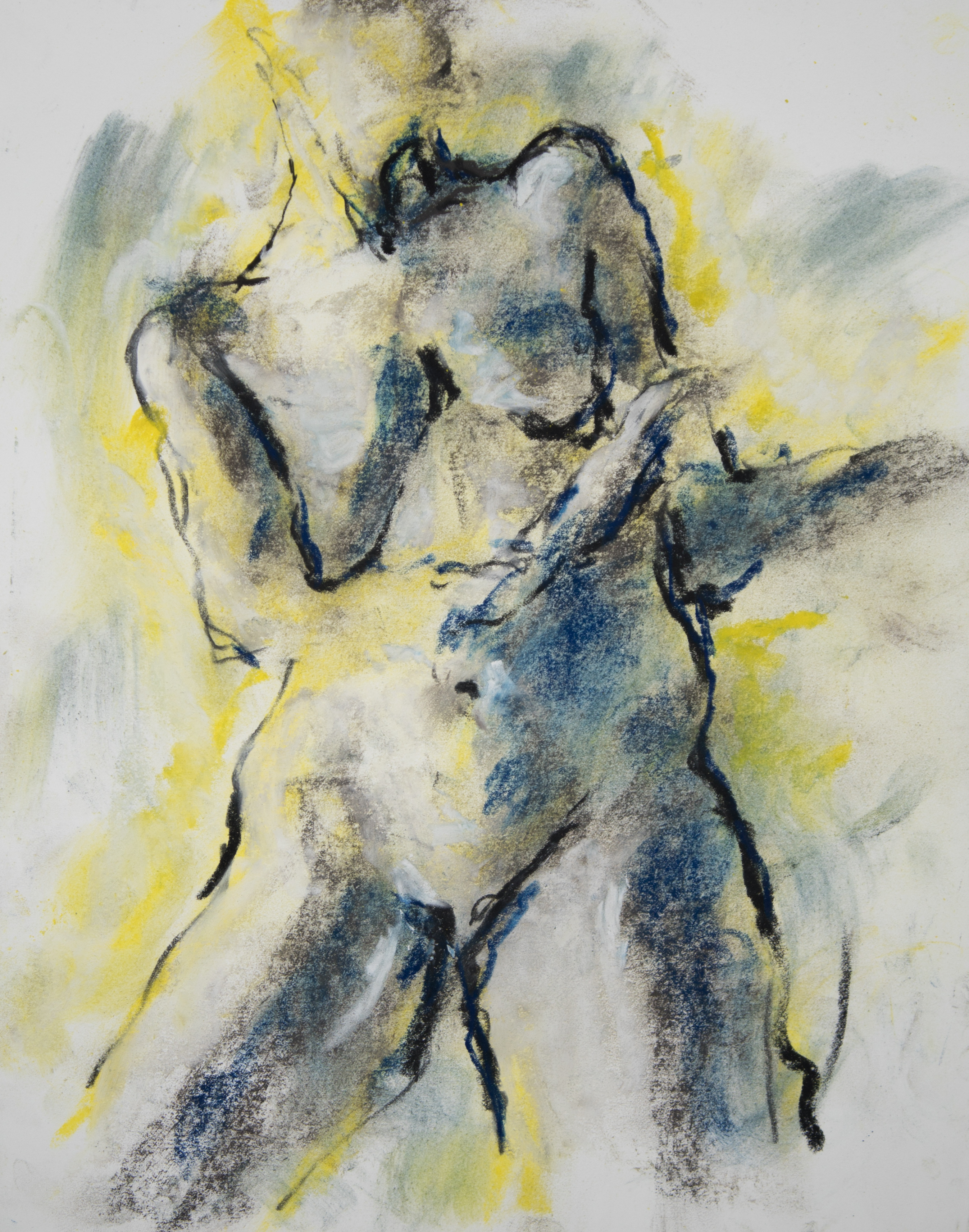 After several decades of constant life drawing I have worked out a method that keeps joy in the process and sustains me day to day. I start with a thick contour and then smudge it with a cloth after which I refine with a more definitive line and add shadow and highlights to finish. I have been exploring a multicolored line and add energy to the charcoal line with adjacent color often bright or complementary to the overall tone. I like to price my work affordably so that it is accessible to the widest possible audience. We need original art on our walls and in our lives. I am always honored when my drawings are chosen.