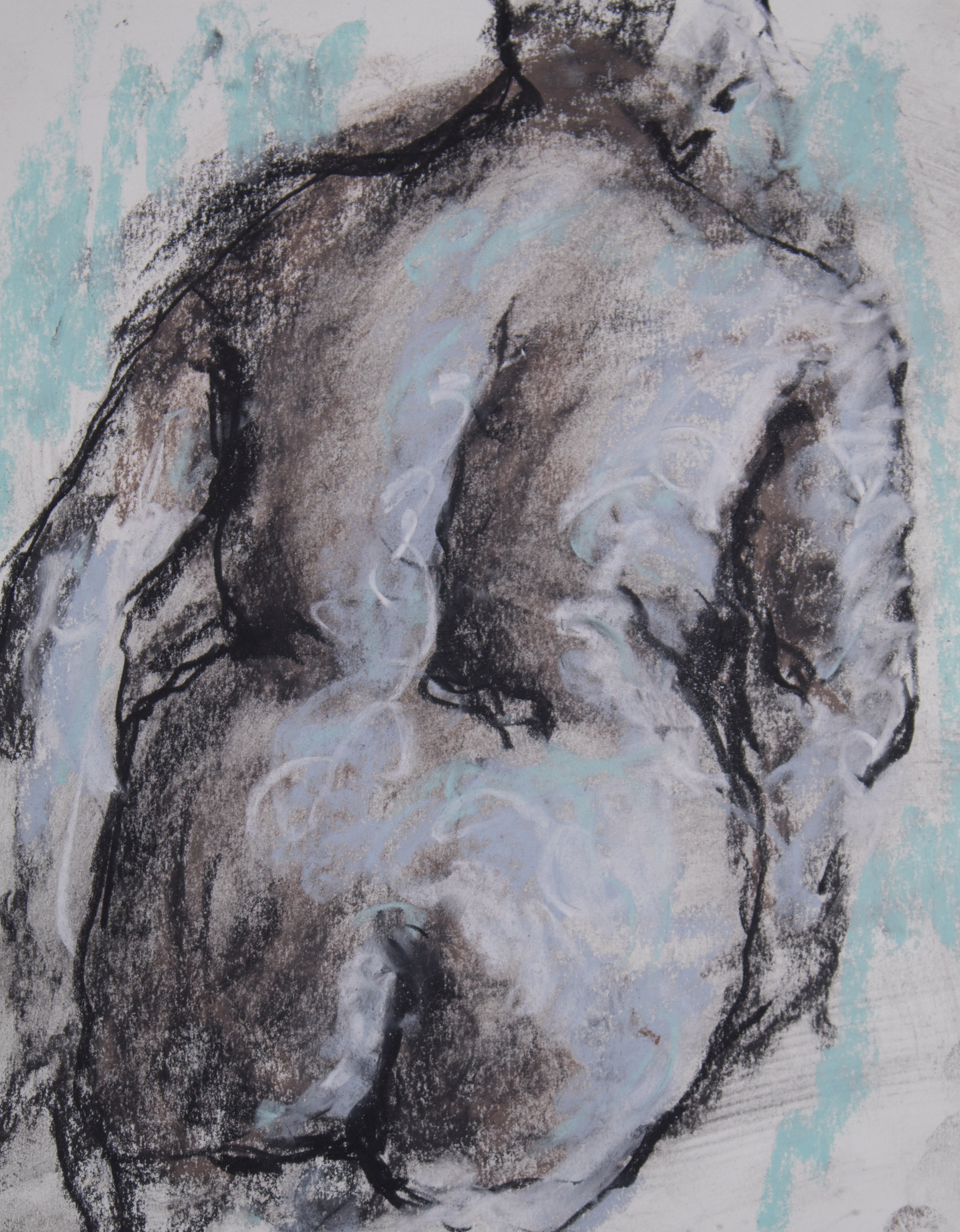 Drawing is of nude female done in charcoal and pastel on white drawing paper.